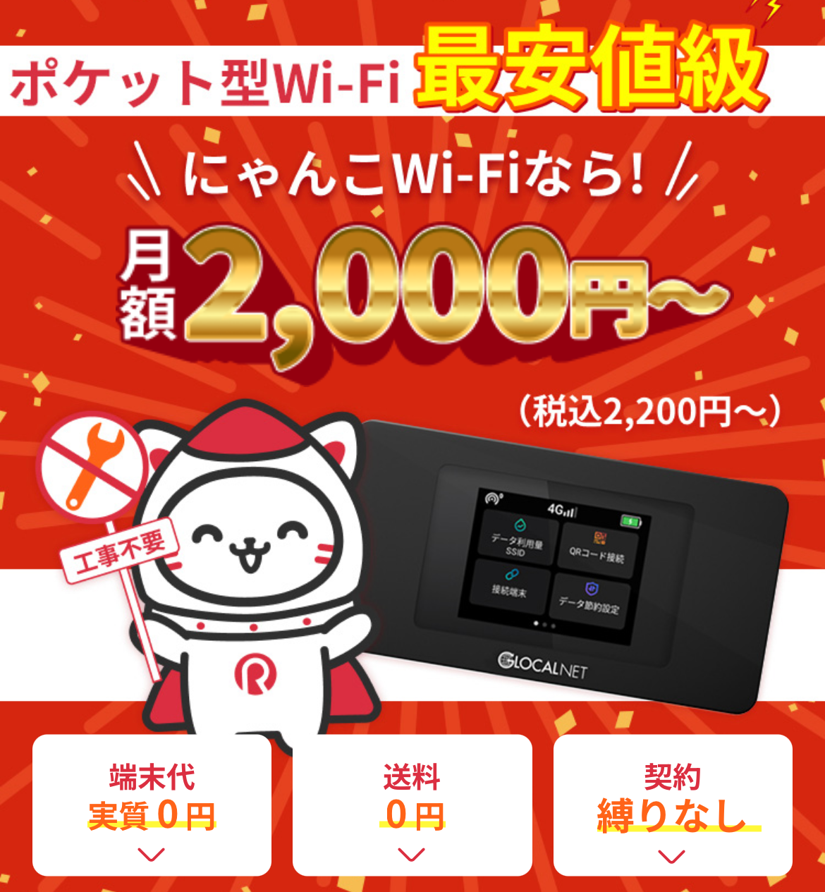 にゃんこWi-Fiは**縛りなしプラン(解約金0円)**があるので、「とりあえず使ってみる」がしやすいです。